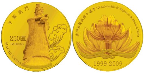 Macau 2009 250 Patacas 10th Anniversary of Return of Sovereignty of Macau 1/4 oz Gold Proof Coin